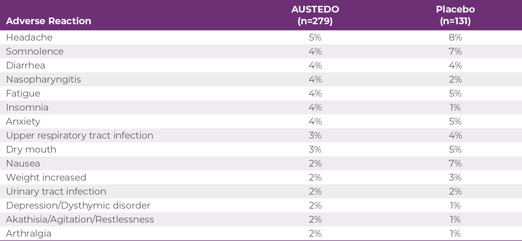 Common Adverse Reactions: The most common adverse reactions for AUSTEDO (>8% and greater than placebo) in a controlled clinical study in patients with Huntington's disease were somnolence, diarrhea, dry mouth, and fatigue. The most common adverse reactions for AUSTEDO (4% and greater than placebo) in controlled clinical studies in patients with tardive dyskinesia were nasopharyngitis and insomnia. Adverse reactions with AUSTEDO XR extended-release tablets are expected to be similar to AUSTEDO tablets.