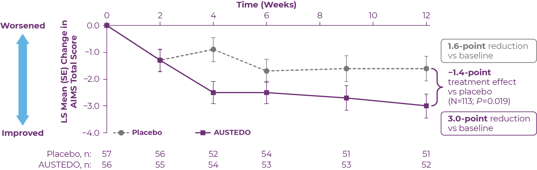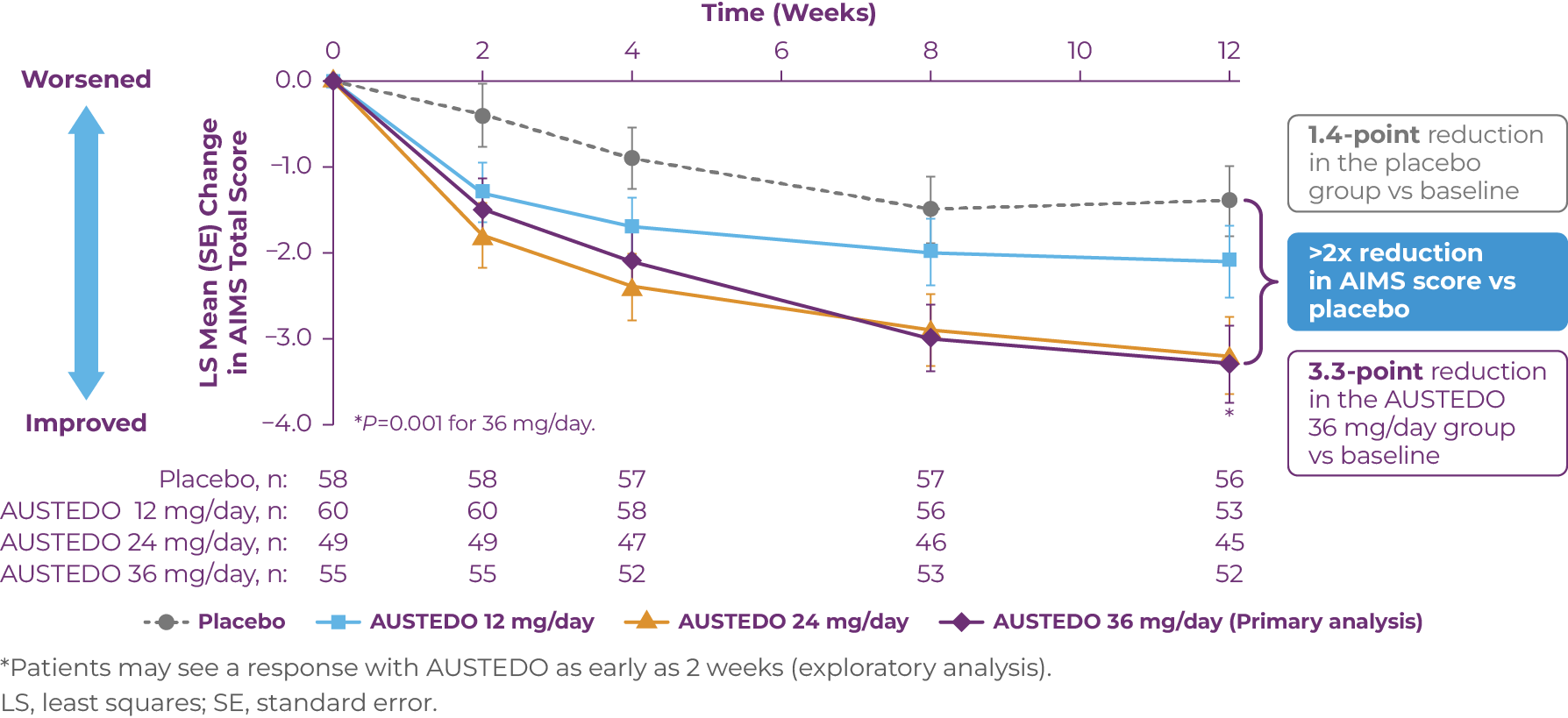 In the AIM-TD study, significant improvement in AIMS total score from baseline (P=0.001) was observed at Week 12 with AUSTEDO 36 mg/day vs placebo (3.3-point reduction vs 1.4-point reduction) (Figure 3.1).13,16 Patients receiving 24 mg/day and 36 mg/day of AUSTEDO saw significant improvements in their AIMS total scores as early as 2 weeks based on an exploratory analysis.16